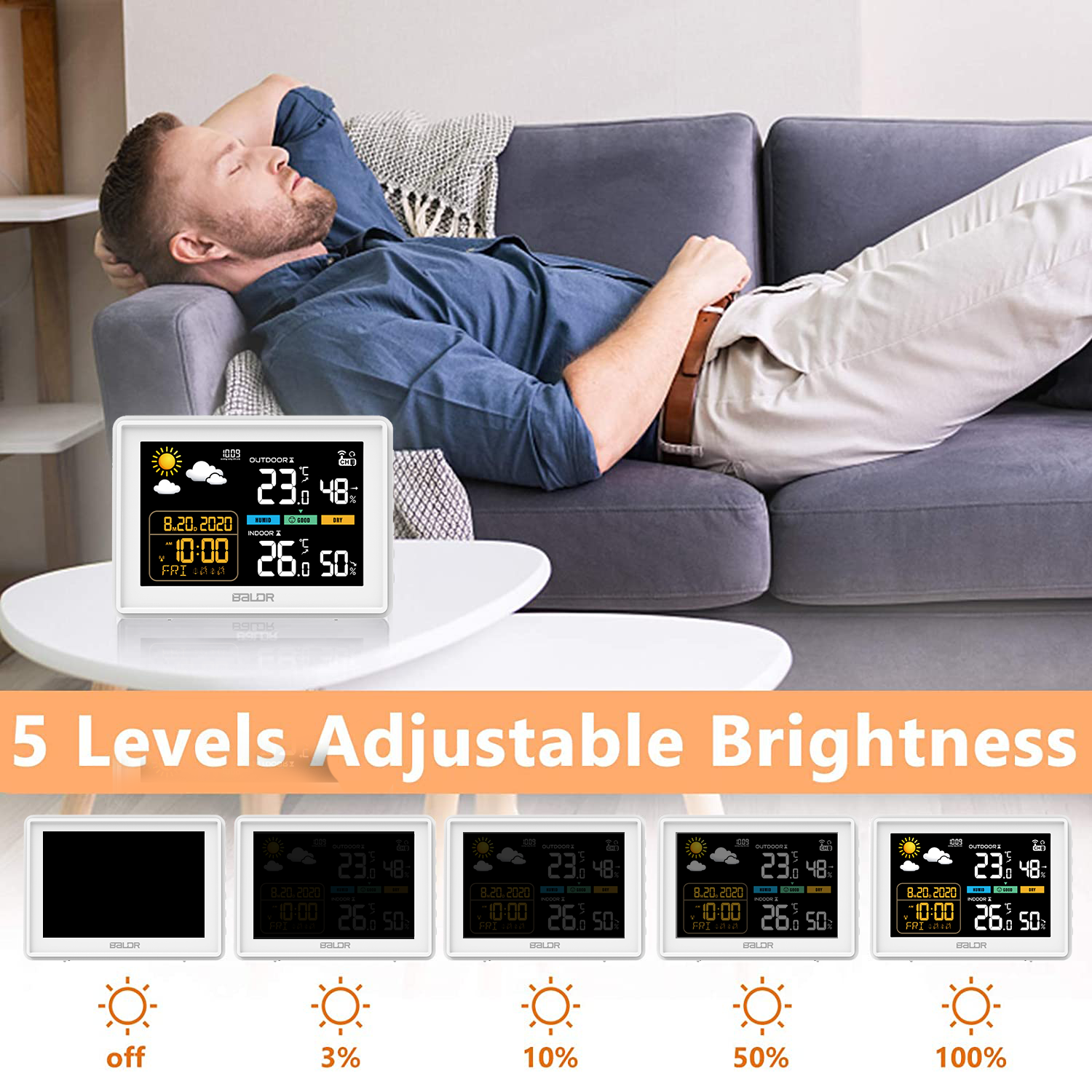 - [Dimmable Brightness] The main station of the weather station is powered by the power cable and can be permanently illuminated. The brightness is adjustable in 4 levels to meet your different requirements during the day and at night.