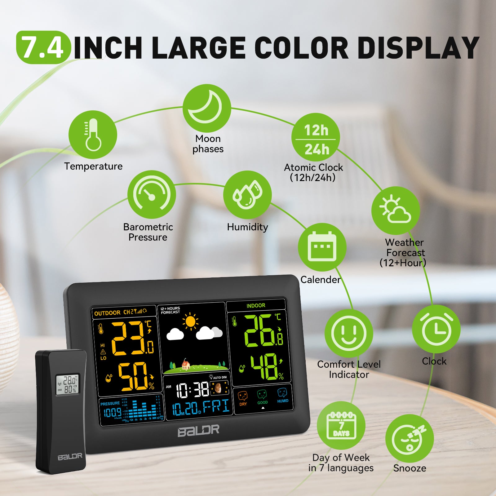 Konsen E0388 Weather Station: 7.4-inch large screen, Wireless Radio-Controlled Clock, Air Pressure Readings, Weather Forecast, Multi-Level Adjustable Backlight